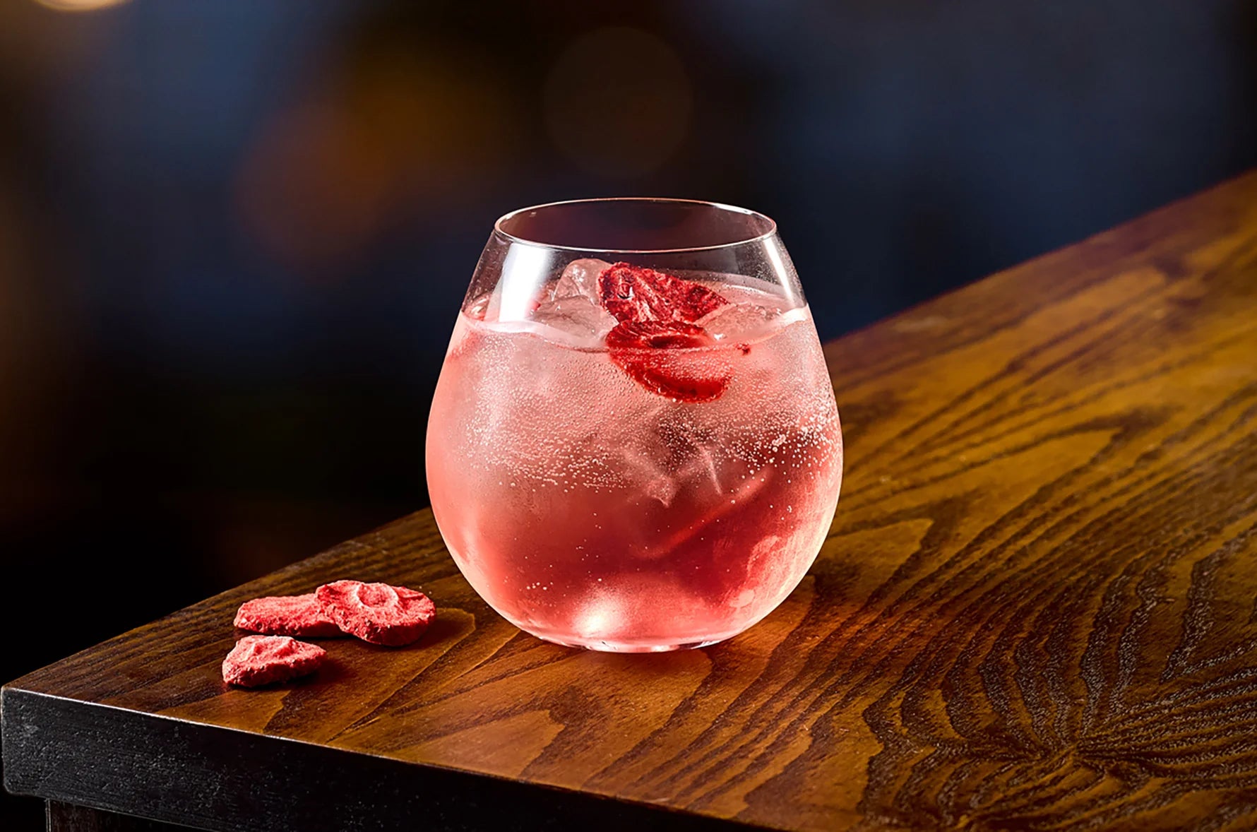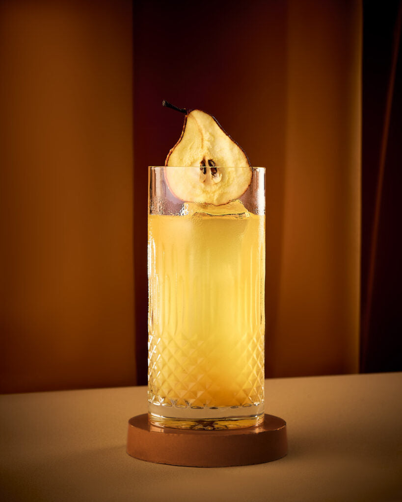 Un cocktail raffiné où la poire séchée apporte douceur et visuel premium.